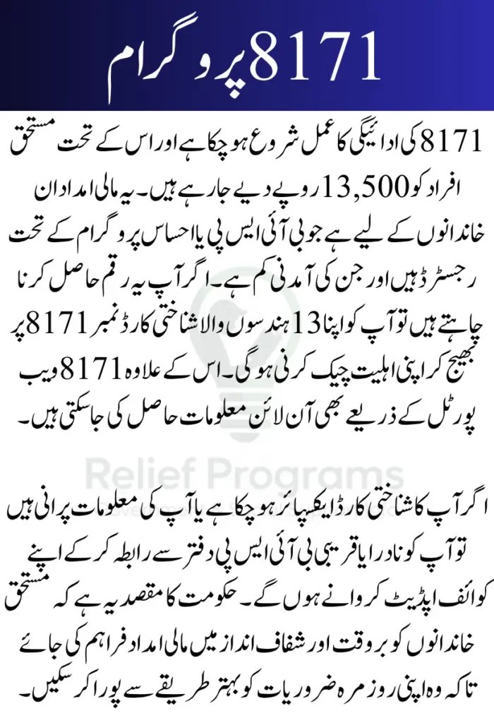 8171 2026 کی ادائیگی کا آغاز ہو چکا ہے اور حکومت پاکستان کی جانب سے مستحق خاندانوں کو 13,500 روپے کی مالی امداد دی جا رہی ہے۔ یہ رقم ملک بھر میں مختلف ادائیگی مراکز اور منتخب بینک برانچز کے ذریعے تقسیم کی جا رہی ہے۔ اگر آپ پہلے سے بی آئی ایس پی پروگرام میں رجسٹرڈ ہیں تو اب اپنی ادائیگی کی تصدیق کرنا بہت آسان ہو گیا ہے۔