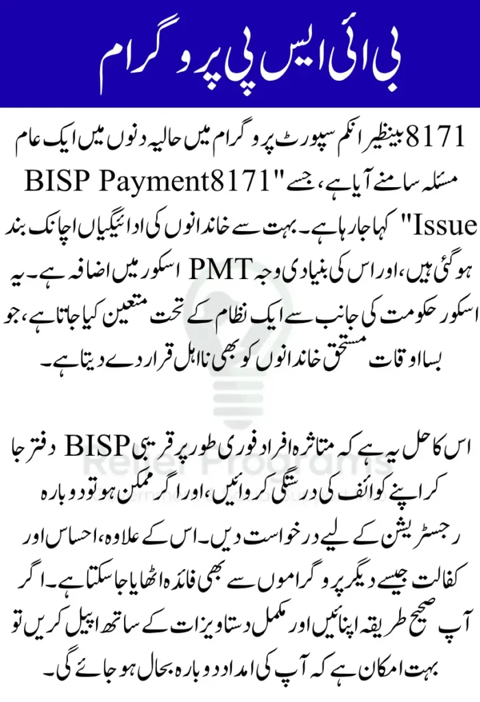 The 8171 BISP Payment Issue due to high PMT scores has affected countless deserving families, but there are solutions. By understanding how the score works, updating your records, and taking action through official channels, you can appeal for reassessment and potentially restore your Rs. 13,500 payments. Government aid systems aren’t perfect, but persistence, documentation, and timely appeals often lead to successful outcomes.