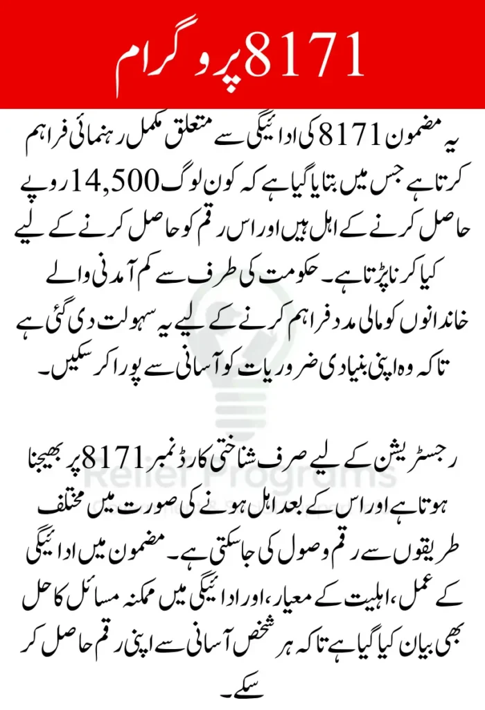 اگر آپ نے پہلے سے رجسٹر نہیں کیا تو فوری طور پر یہ کام کریں تاکہ آپ بھی اس رقم کے مستحق بن سکیں۔ شناختی کارڈ نمبر 8171 پر ایس ایم ایس کرنے کے بعد آپ کی اہلیت چیک کی جاتی ہے اور اگر آپ اہل ہوئے تو آپ کو ادائیگی کی معلومات فراہم کی جاتی ہے۔ اس رقم کا استعمال آپ روزمرہ کی ضروریات کے لیے کر سکتے ہیں۔