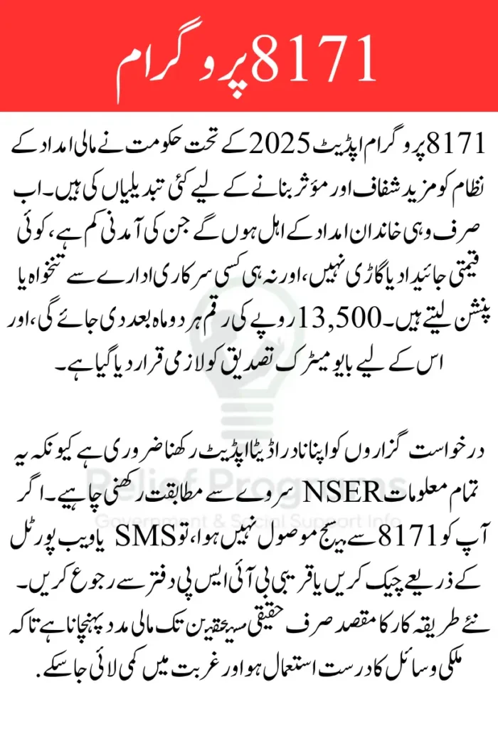 8171 پروگرام اپڈیٹ 2026 کے تحت حکومت پاکستان نے نیا نظام متعارف کرایا ہے تاکہ صرف وہی خاندان امداد حاصل کر سکیں جو حقیقی طور پر مستحق ہیں۔ اس میں نادرا اور نیشنل سوشیو اکنامک رجسٹری کے ڈیٹا کی مدد سے گھرانوں کی آمدنی، پراپرٹی، اور دیگر مالی حالات کا جائزہ لیا جاتا ہے۔ اس اپڈیٹ کے بعد جعلی درخواستوں کی گنجائش بہت کم ہو گئی ہے۔