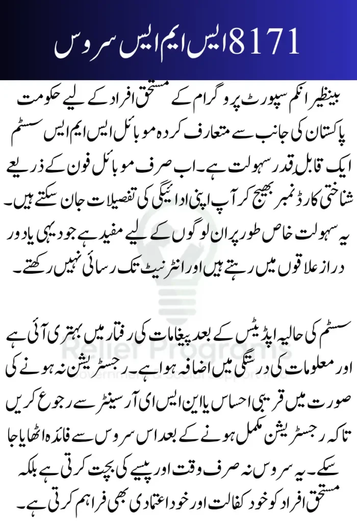 The 8171 SMS system is an official initiative by the Government of Pakistan. It lets registered BISP beneficiaries check whether their payment has been issued or if their family qualifies for upcoming disbursements. Users simply send their CNIC number to 8171 and receive an instant reply with the relevant information.