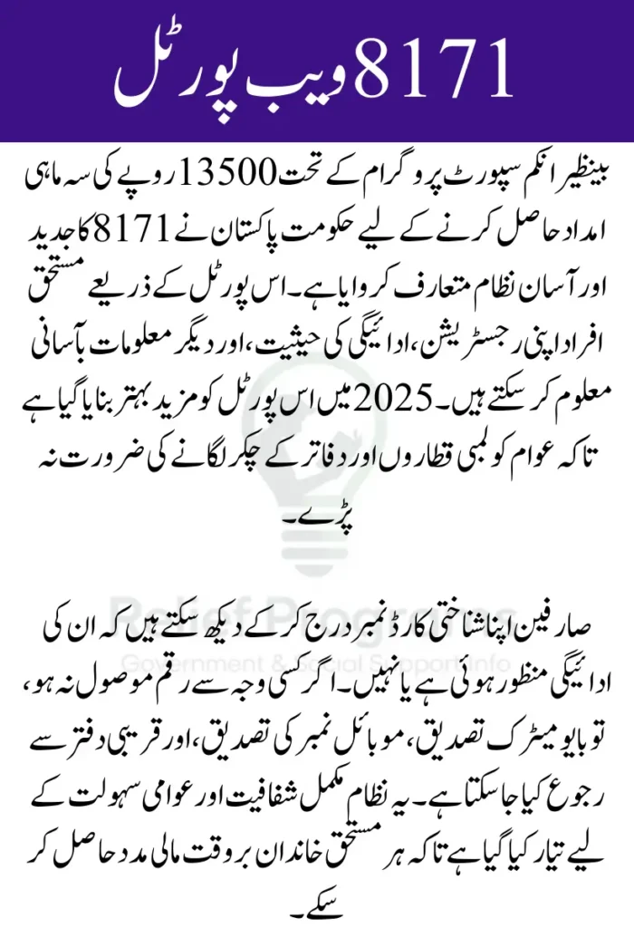 The 8171 Web Portal is a government-backed platform where individuals can enter their CNIC number and instantly check the status of their 13500 rupee installment. Whether the payment has been sent, delayed, or blocked, the system displays real-time updates tied to your National Socio-Economic Registry (NSER) data.