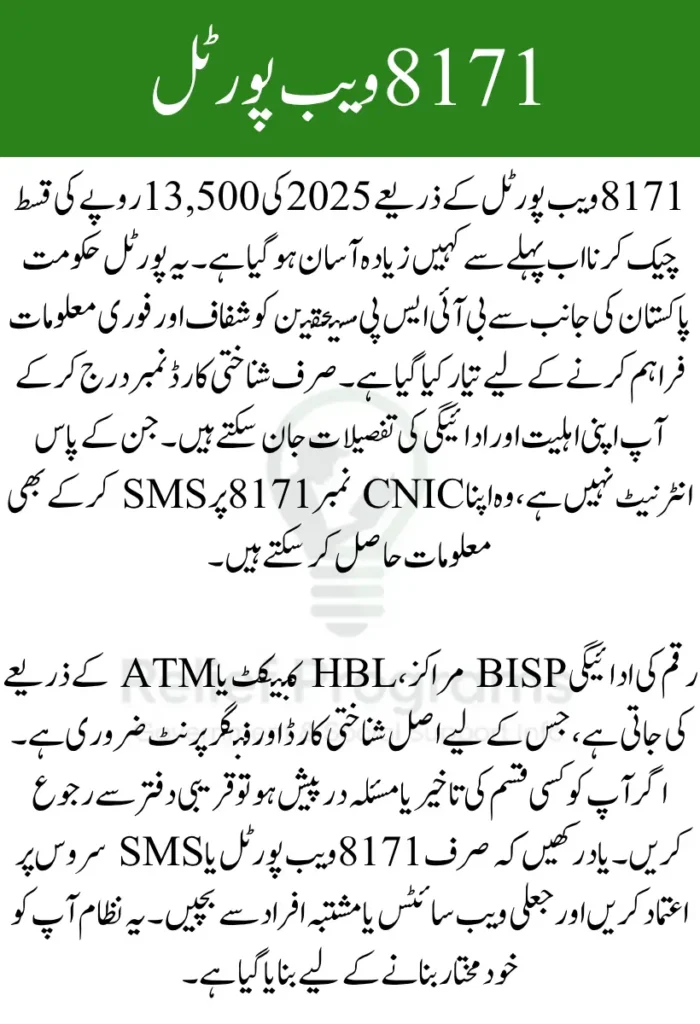 Beware of fake websites and fraudulent messages. The 8171 Web Portal and SMS service are the only official platforms for checking your BISP status. Do not share your CNIC or personal details with unauthorized individuals.
