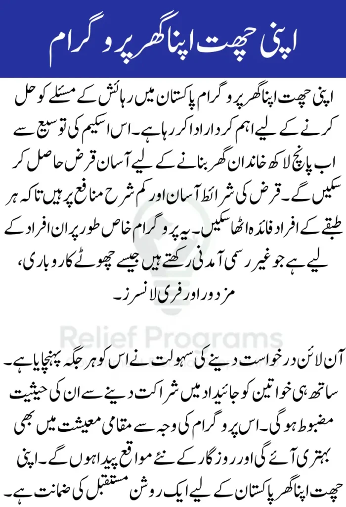 یہ پروگرام خاص طور پر ان خاندانوں کے لیے بنایا گیا ہے جو اپنی محدود آمدنی کی وجہ سے گھر نہیں بنا پاتے تھے۔ اب اپنی چھت اپنا گھر پروگرام کے تحت آسان قرضوں کی فراہمی سے لاکھوں خاندان اپنے خوابوں کا گھر بنا سکیں گے۔ اس پروگرام کے ذریعے مالی رکاوٹیں کم کی گئی ہیں تاکہ ہر فرد کو گھر کا حق ملے۔
