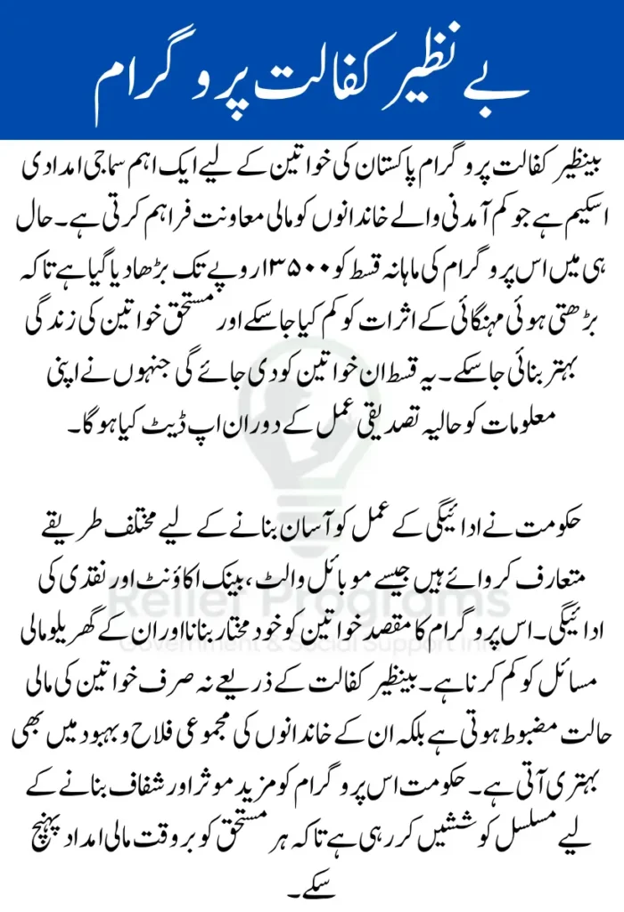 بینظیر کفالت خاص طور پر ان خواتین کے لیے ہے جو گھریلو ذمہ داری سنبھالتی ہیں اور جن کے خاندان میں بچے، بزرگ یا معذور افراد شامل ہیں۔ حکومت نے اس پروگرام میں شفافیت اور سہولت کے لیے کئی ادائیگی کے طریقے متعارف کرائے ہیں تاکہ ہر مستحق کو وقت پر مالی امداد مل سکے۔