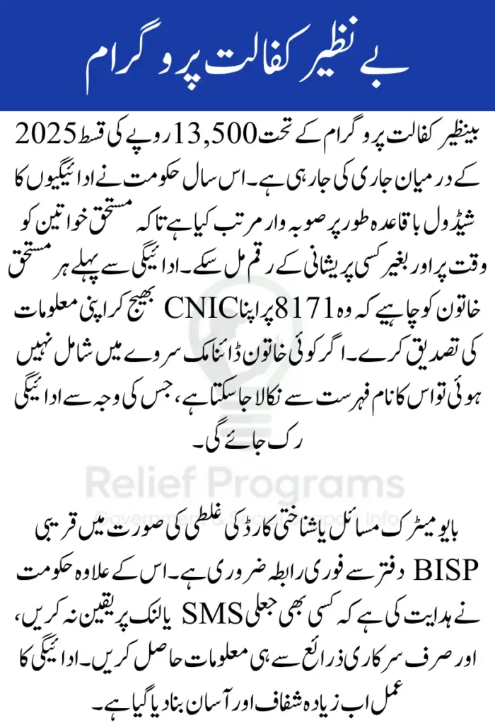 بینظیر کفالت پروگرام کی تازہ قسط 13500 روپے کے تحت دی جا رہی ہے۔ حکومت نے اس بار ادائیگیوں کا شیڈول صوبہ وار ترتیب دیا ہے تاکہ رش کم ہو اور خواتین آسانی سے اپنی رقم حاصل کر سکیں۔ اس کے لیے صرف اپنا شناختی کارڈ نمبر 8171 پر بھیجیں اور تصدیق کریں کہ آپ کی قسط کب جاری ہو گی۔