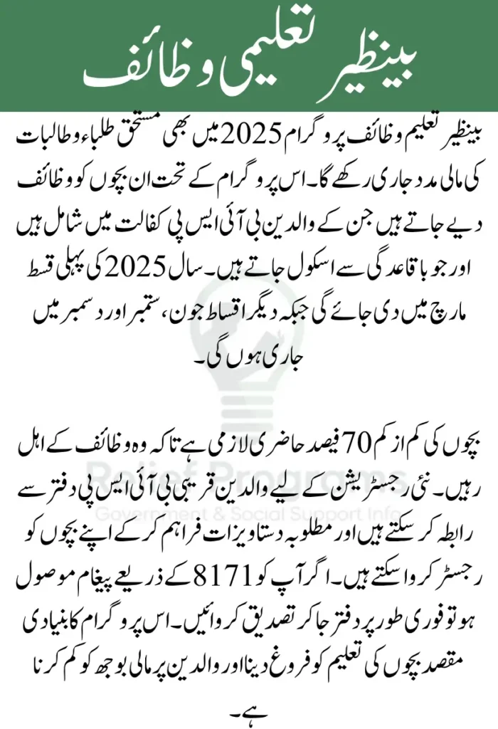 بینظیر تعلیم وظائف پروگرام کا مقصد غریب اور مستحق بچوں کو تعلیم حاصل کرنے کے لیے مالی مدد فراہم کرنا ہے۔ یہ پروگرام بچوں کے تعلیمی اخراجات کو پورا کرنے میں والدین کا ساتھ دیتا ہے تاکہ وہ اپنے بچوں کو اسکول بھیجنے میں کسی مالی رکاوٹ کا سامنا نہ کریں۔ حکومت نے اس پروگرام کے ذریعے والدین کو ترغیب دی ہے کہ وہ بچوں کو باقاعدگی سے اسکول بھیجیں تاکہ وہ مستقبل میں بہتر مواقع حاصل کر سکیں۔