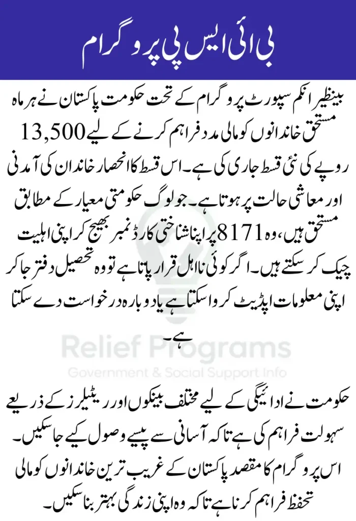 پاکستان میں غریب خاندانوں کو مالی مدد دینے کے لیے حکومت بینظیر انکم سپورٹ پروگرام کے تحت ماہانہ قسطیں دیتی ہے۔ ہر ماہ بہت سے لوگ جاننا چاہتے ہیں کہ آیا وہ اس مہینے کی ادائیگی کے اہل ہیں یا نہیں۔ اس کے لیے 8171 پر اپنا شناختی کارڈ نمبر بھیج کر آپ آسانی سے معلوم کر سکتے ہیں کہ آپ کو پیسہ ملے گا یا نہیں۔