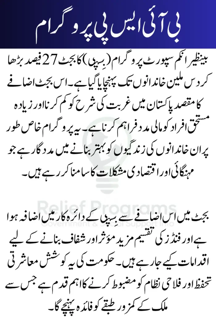بینظیر انکم سپورٹ پروگرام (بِسپی) کا بجٹ 27 فیصد بڑھا دیا گیا ہے جس سے ملک بھر میں دس ملین خاندانوں کو مالی مدد دی جا رہی ہے۔ یہ اضافہ حکومت کی طرف سے غربت کے خاتمے اور معاشرتی بہبود کو بڑھانے کی کوششوں کا حصہ ہے۔ اس اضافے کی بدولت زیادہ مستحق خاندانوں کو امداد ملے گی جو معاشی دباؤ کا شکار ہیں۔