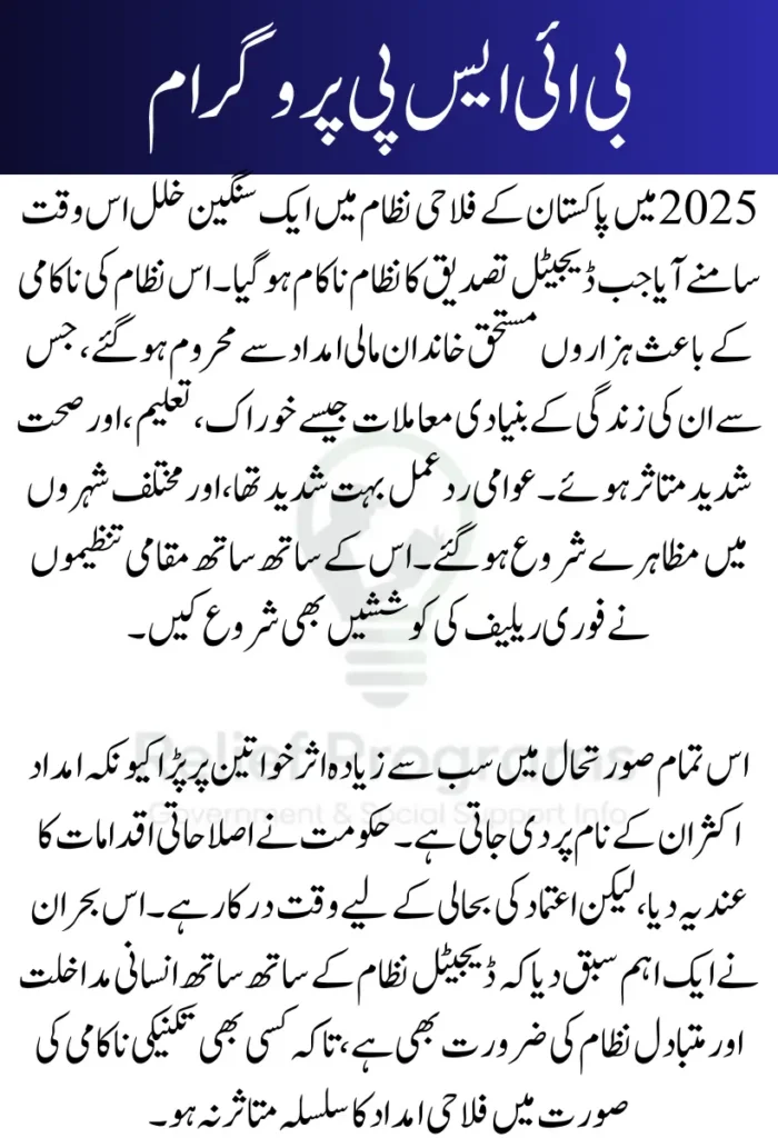 2025 میں پاکستان کے فلاحی نظام میں ایک بڑی رکاوٹ آئی، جس نے ہزاروں خاندانوں کو مالی بحران میں ڈال دیا۔ یہ رکاوٹ ایک ڈیجیٹل نظام میں خرابی کی وجہ سے پیدا ہوئی، جس پر غربت کے شکار لوگ مکمل طور پر انحصار کر رہے تھے۔