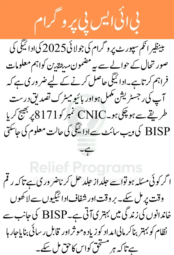 بینظیر انکم سپورٹ پروگرام کی 2025 کی ادائیگی کی صورتحال جاننے کے لیے مستحق افراد اپنا CNIC نمبر 8171 پر بھیج سکتے ہیں۔ اس سے انہیں فوری معلومات مل جاتی ہیں کہ ان کی ادائیگی منظور ہوئی ہے یا زیرِ غور ہے۔ بروقت ادائیگی کے لیے ضروری ہے کہ رجسٹریشن اور بائیو میٹرک ڈیٹا درست اور مکمل ہو۔