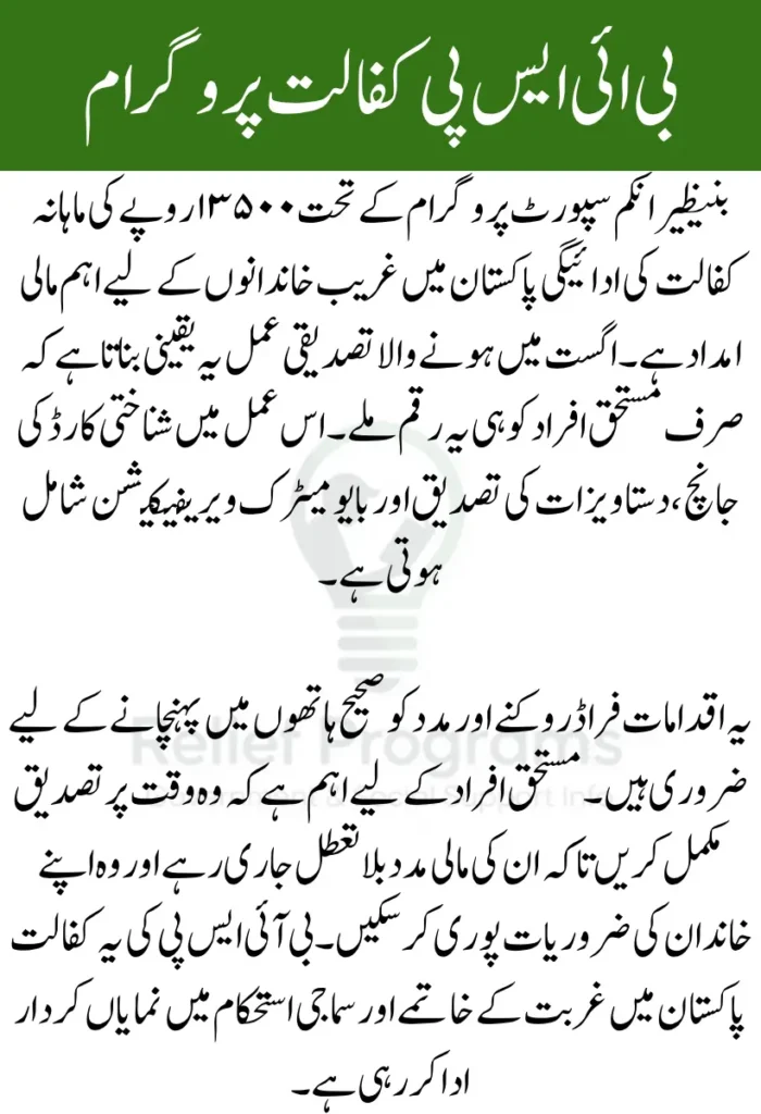 بنیظیر انکم سپورٹ پروگرام (بی آئی ایس پی) نے پاکستانی خاندانوں کی مالی مدد کے لیے ایک مضبوط نظام قائم کیا ہے۔ ہر ماہ ۱۳۵۰۰ روپے کی امداد غریب خاندانوں کو اپنی روزمرہ کی ضروریات پوری کرنے میں مدد دیتی ہے۔ اگست میں ہونے والا تصدیقی عمل بہت اہم ہے کیونکہ اس کے ذریعے مستحق افراد کی شناخت کی جاتی ہے اور غلط استعمال روکا جاتا ہے۔