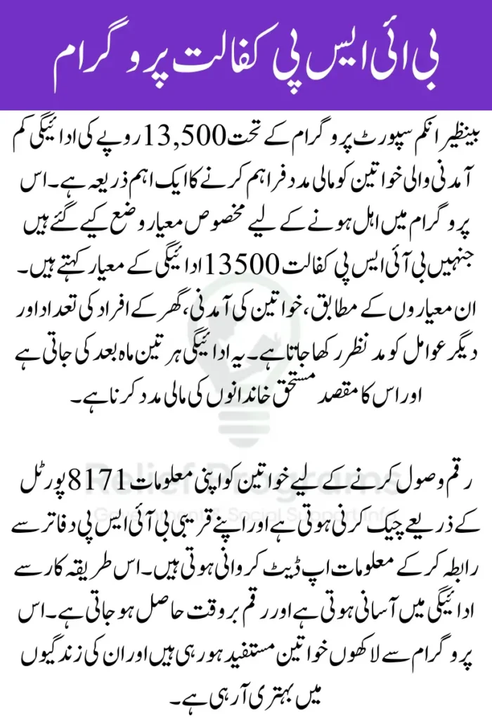بینظیر انکم سپورٹ پروگرام کا مقصد کم آمدنی والی خواتین کی مدد کرنا ہے تاکہ وہ اپنے خاندان کے لیے بہتر سہولیات فراہم کر سکیں۔ اس پروگرام کے تحت ہر تین ماہ بعد رقم دی جاتی ہے جو گھر کے روزمرہ کے اخراجات میں مددگار ہوتی ہے۔ اہل خواتین اپنی معلومات کو چیک کرنے کے لیے 8171 پورٹل استعمال کر سکتی ہیں تاکہ ادائیگی میں کسی قسم کی رکاوٹ نہ ہو۔