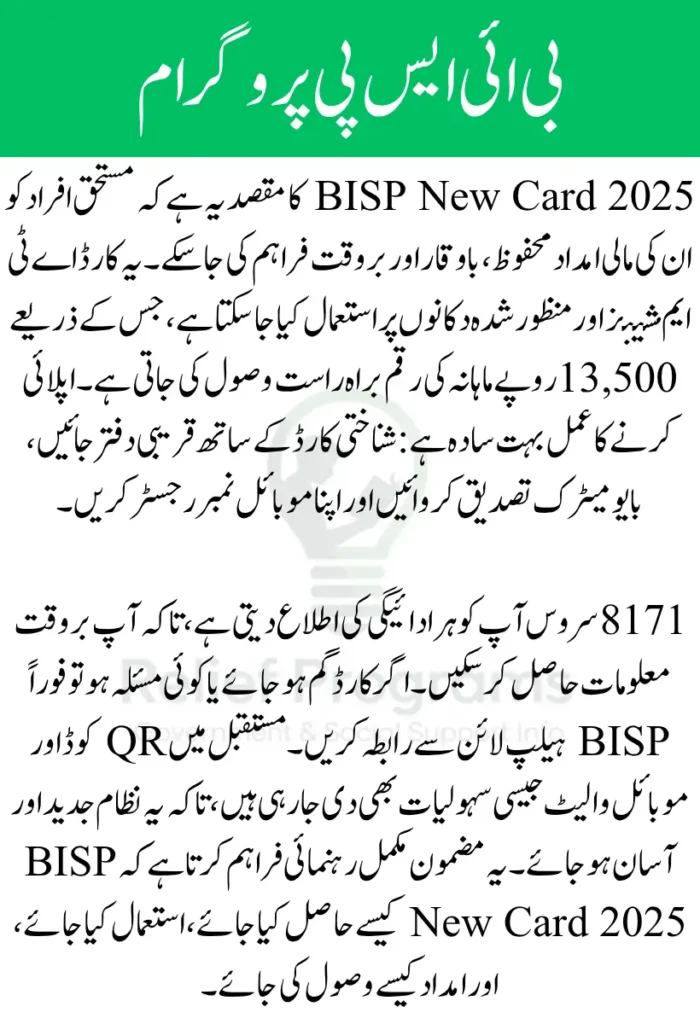 Applying for the card is easier than before. Simply take your CNIC card to your local BISP registration center, complete the biometric verification, and register your mobile number. Once approved, you’ll be issued a BISP New Card, ready for use at ATMs and partner merchants.
