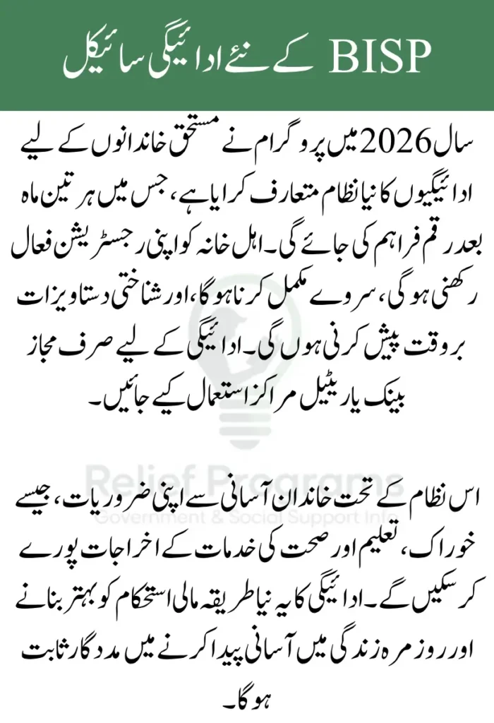 In 2026, the government announced changes to the BISP New Payment Cycle to provide consistent support to eligible families. Under this update, payments will be distributed every three months, giving families a predictable schedule for receiving assistance.