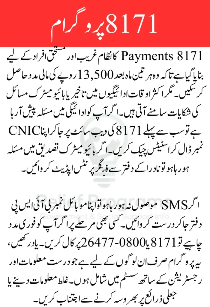 BISP operates a dedicated helpline for 8171 Payments complaints and questions. Dial 8171 or 0800-26477 from your mobile to speak with a representative. Have your CNIC number ready for quicker service.