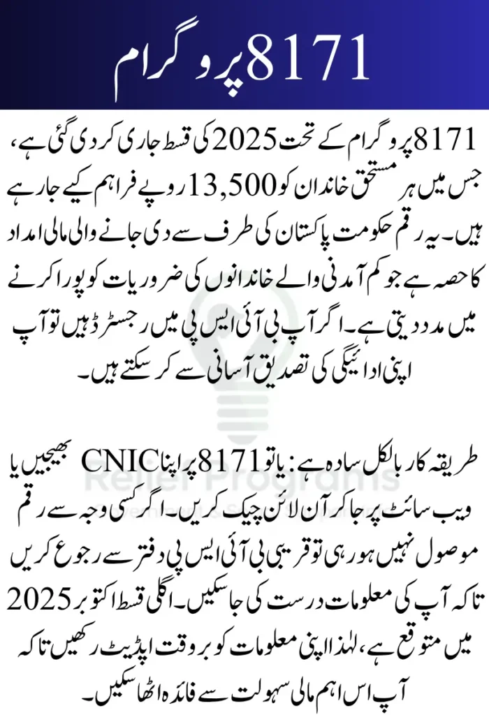 حکومت پاکستان نے 2025 میں 8171 پروگرام کے تحت 13,500 روپے کی قسط جاری کر دی ہے۔ یہ مالی امداد ان مستحق خاندانوں کے لیے ہے جو غربت کی لکیر سے نیچے زندگی گزار رہے ہیں۔ اس پروگرام کا مقصد بنیادی ضروریات جیسے کہ خوراک، تعلیم اور علاج میں مدد فراہم کرنا ہے تاکہ کم آمدنی والے گھرانے باعزت طریقے سے زندگی گزار سکیں۔
