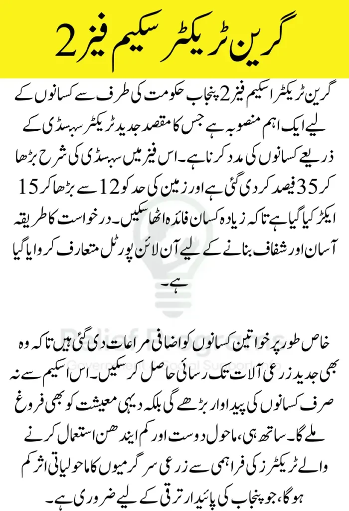 پنجاب حکومت نے کسانوں کی مدد کے لیے گرین ٹریکٹر اسکیم فیز 2 شروع کی ہے۔ اس اسکیم کے ذریعے کسان سستے داموں جدید ٹریکٹر حاصل کر سکیں گے، جو ان کی کاشتکاری میں بہتری کا باعث بنے گا۔ وزیراعلیٰ پنجاب نے اس اسکیم کا افتتاح کیا ہے تاکہ کسانوں کو جدید سہولیات فراہم کی جائیں۔