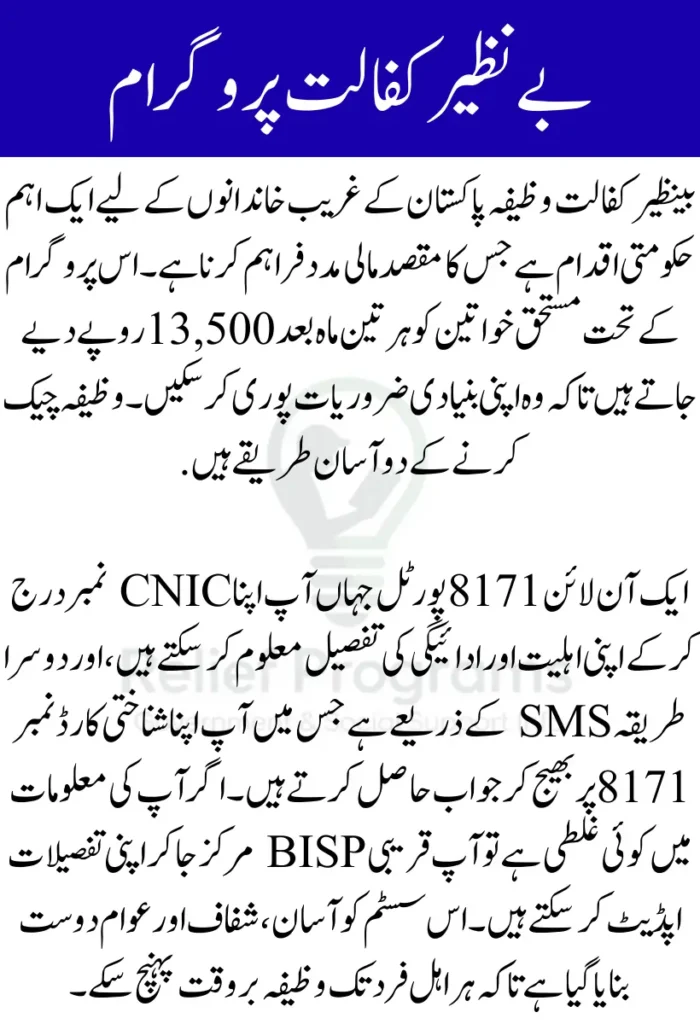 اگر آپ یہ جاننا چاہتے ہیں کہ آپ وظیفے کے اہل ہیں یا نہیں تو آپ 8171 ویب پورٹل کے ذریعے آن لائن چیک کر سکتے ہیں۔ ویب سائٹ پر اپنا قومی شناختی کارڈ نمبر درج کریں اور چند لمحوں میں آپ کو اپنی اہلیت کی تفصیل معلوم ہو جائے گی۔ یہ پورٹل ہر وقت دستیاب ہے اور استعمال میں آسان ہے۔