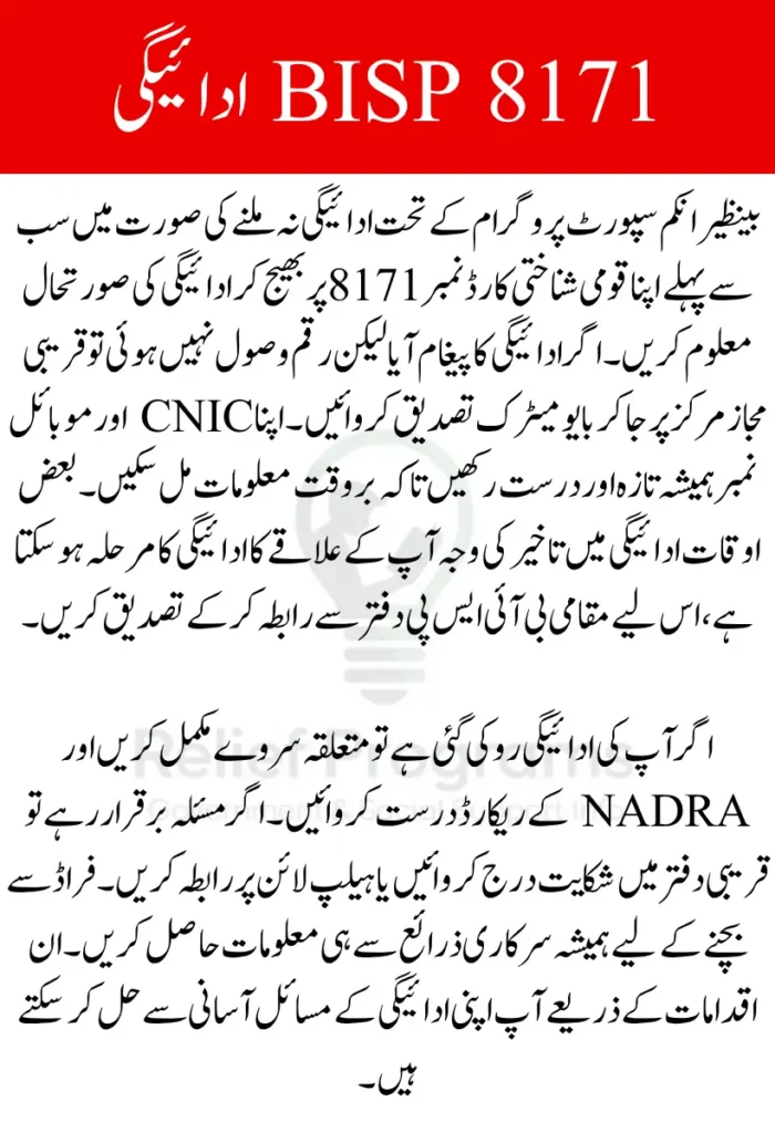 Unfortunately, some fraudsters try to exploit beneficiaries by pretending to help with BISP missing payment problems. Always confirm any communication through official BISP channels. Never share your personal or banking information with unauthorized individuals or pay money to expedite your payment.