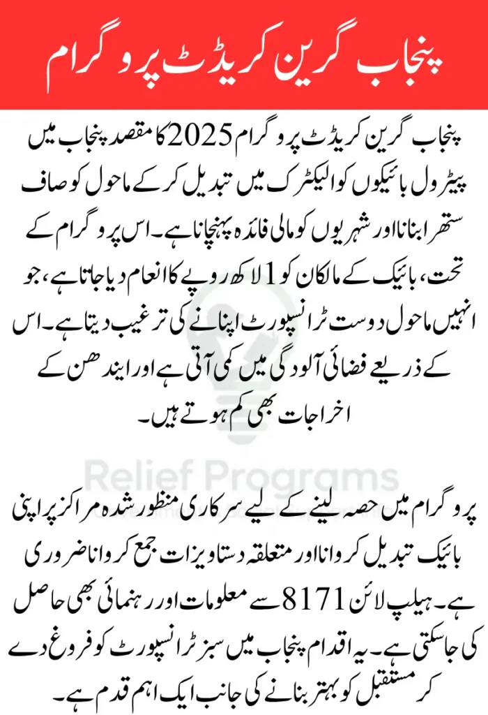 پنجاب گرین کریڈٹ پروگرام ایک اہم اسکیم ہے جو ماحول کو صاف رکھنے کے لیے شروع کی گئی ہے۔ اس پروگرام کے تحت آپ اپنی پیٹرول بائیک کو الیکٹرک میں تبدیل کروا سکتے ہیں اور حکومت سے 1 لاکھ روپے کا انعام حاصل کر سکتے ہیں۔ اس سے نہ صرف فضائی آلودگی میں کمی آئے گی بلکہ آپ کو مالی فائدہ بھی ہوگا۔ پروگرام میں حصہ لینے کے لیے آپ کو اپنی بائیک کی رجسٹریشن اور دیگر ضروری دستاویزات تیار رکھنی ہوں گی۔