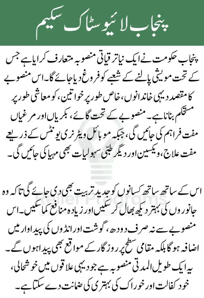 حکومت پنجاب نے ایک نیا منصوبہ شروع کیا ہے جس کا مقصد دیہی علاقوں میں مویشی پالنے کے شعبے کو ترقی دینا ہے۔ اس منصوبے سے کسانوں کو مفت جانور، ویٹرنری سہولیات اور تربیت دی جائے گی تاکہ وہ بہتر آمدنی حاصل کر سکیں۔