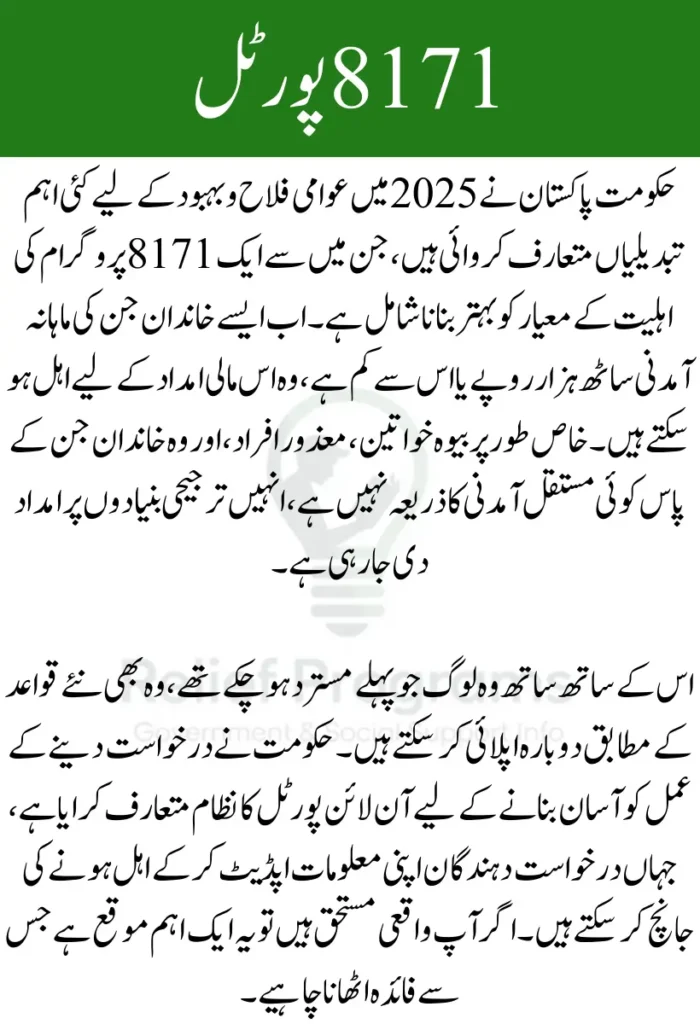 8171 پروگرام کی نئی پالیسی کے مطابق اب کم آمدنی والے خاندانوں کے لیے مالی مدد حاصل کرنا پہلے سے زیادہ آسان ہو گیا ہے۔ اگر آپ کی ماہانہ آمدنی ساٹھ ہزار روپے سے کم ہے تو آپ امداد کے اہل ہو سکتے ہیں۔ حکومت نے شفاف طریقہ کار اپناتے ہوئے درخواست دینے کا عمل آن لائن کر دیا ہے تاکہ زیادہ سے زیادہ مستحق افراد فائدہ اٹھا سکیں۔